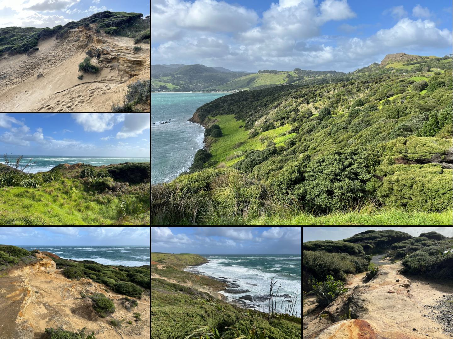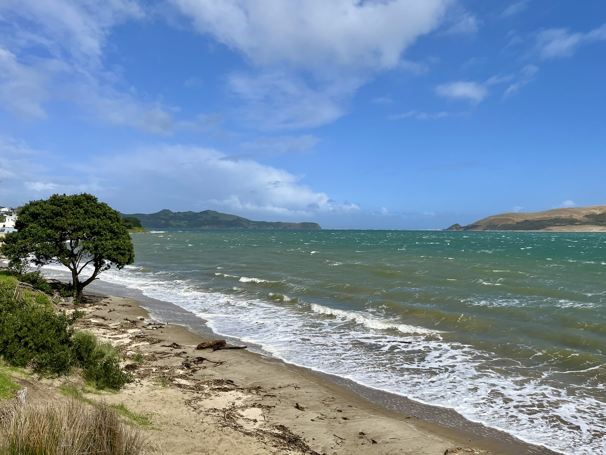 Next was lunch, sandwiches, while enjoying the view of the Hokianga gate and getting blasted by the wind which was really picking up as I was closing in on the western shore of Northland. That gate was my next stop, more specifically the southern spur with its Signal Station lookout. Starting out with a lovely exposed stone hill at your back when leaving the carpark along a protected path, only to meet the full brunt of a roused Tasman Sea with winds at least above 20 m/s (I think, that’s allways very hard to guage). Then out along this narrowing, erroded sand peninsula with some really lovely views both i towards the harbour, and out at the open ocean.