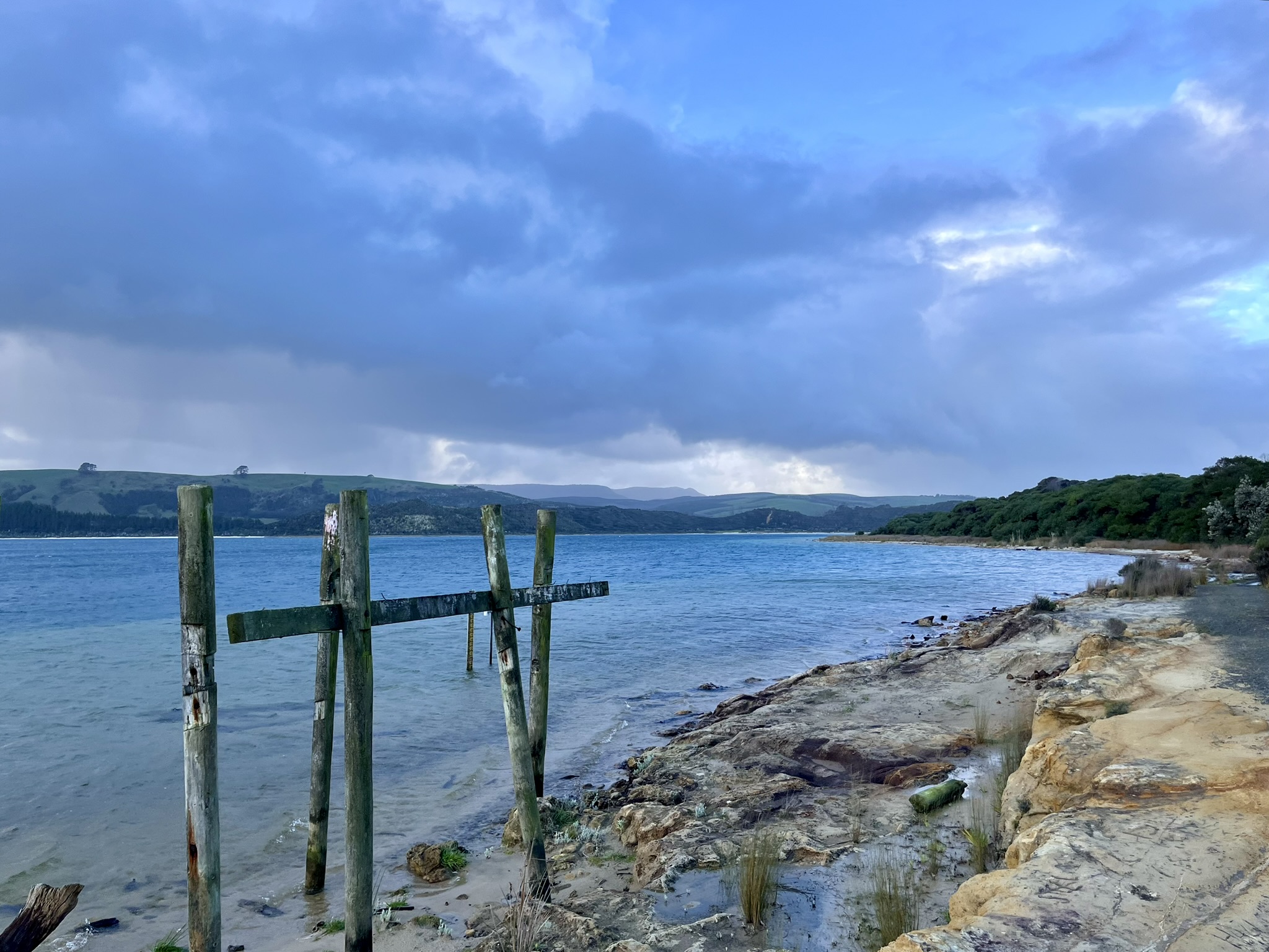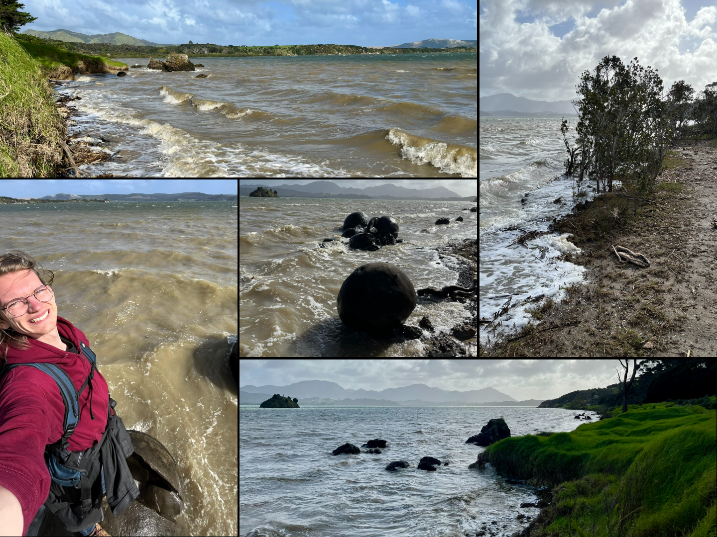 While my initial plan was to take the ferry across the Hokianga harbour, I realised after my first little break for coffee at the cross roads with some cows, that it would be very tight to make it in time. Instead, I went the long way round, and after a while found my self being routed by Google through gravel roads on a “shortcut” through a bend in the major road. I do think it actually was a shortcut in the end, but was a little bit hairy with the amount of road damage caused by the recent foul weather. Probably around two hours after setting out, I arrived at my first stop, the Koutu Boulders. Very round large rocks that I had found on maps while scouting this leg. What I hadn’t paid attention to was the fact that they were on the foreshore, and it was high tide when I got there.