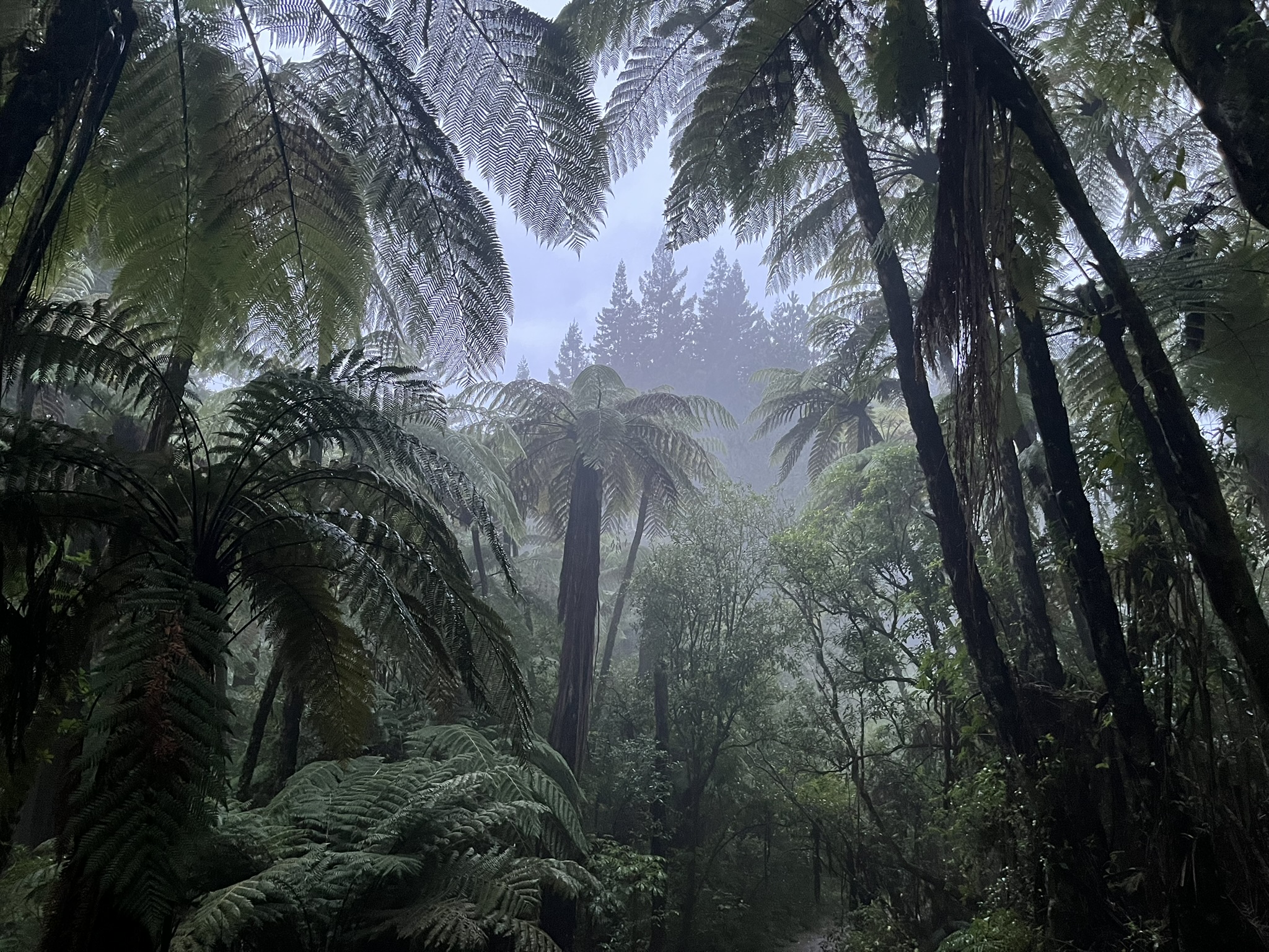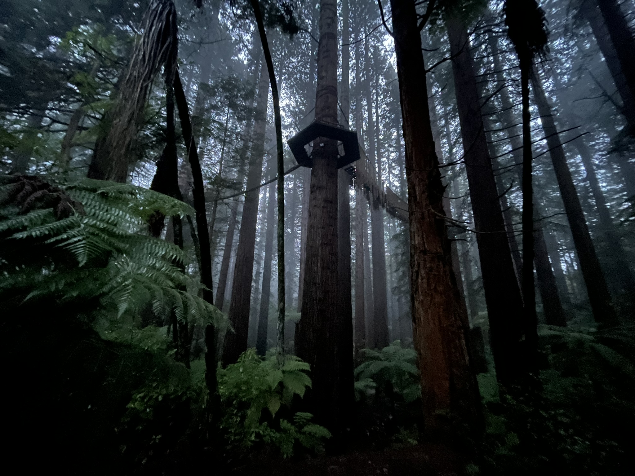 Walking among those giants in the fog, as twilight fell, was really quite something. Very different than any other forest I’d been to so far in New Zealand, it both felt extremely alien and somewhat like home. My route among them brought me up the back hills of the forest, where an old quarry lay offering some views, off mostly fog.