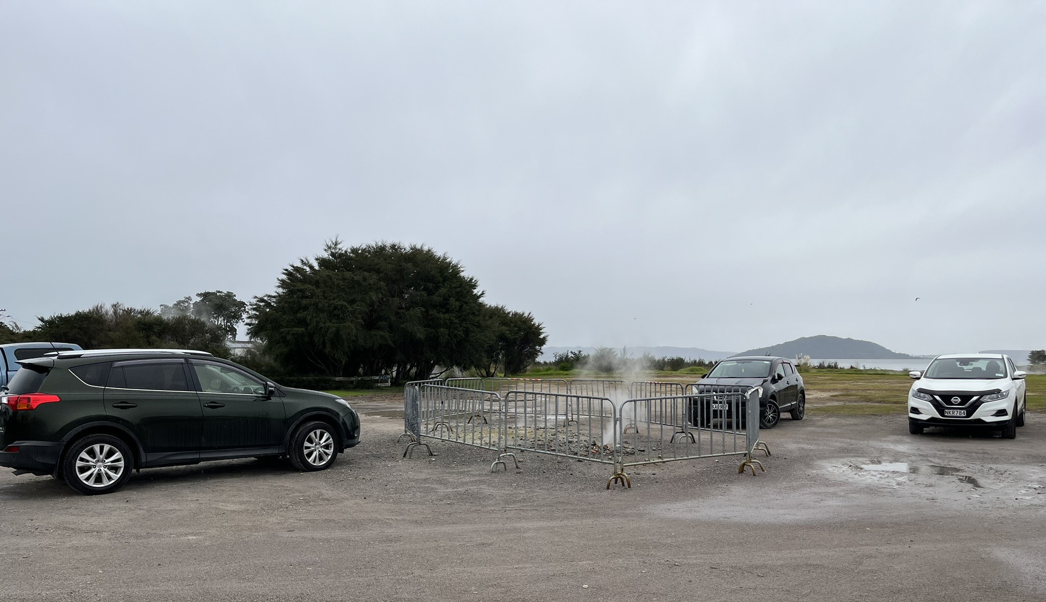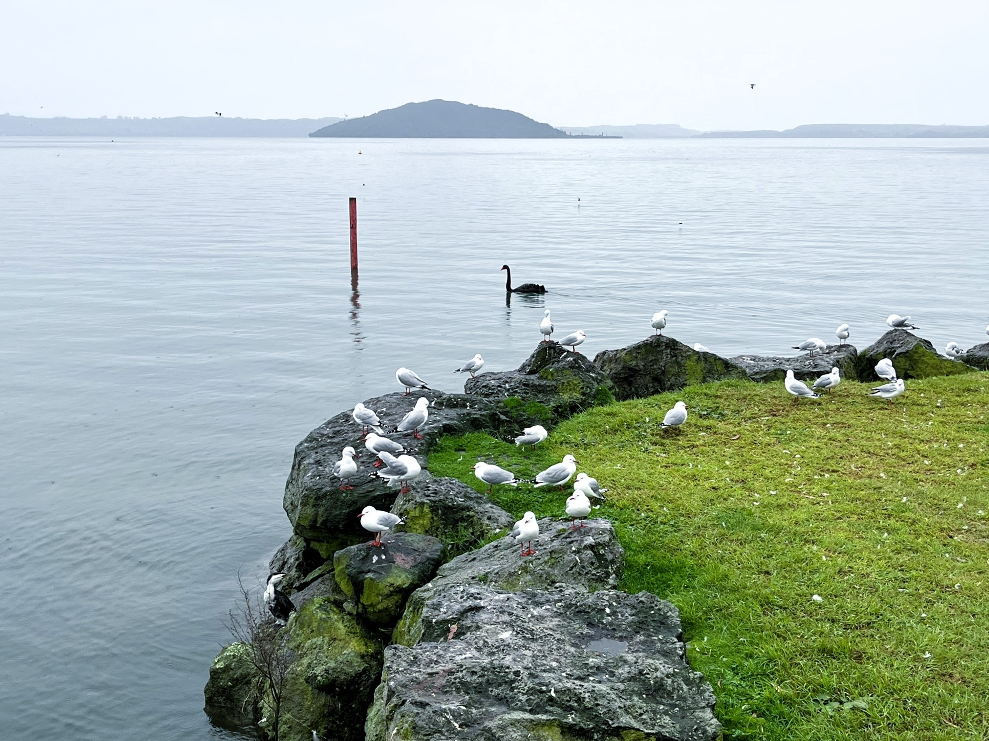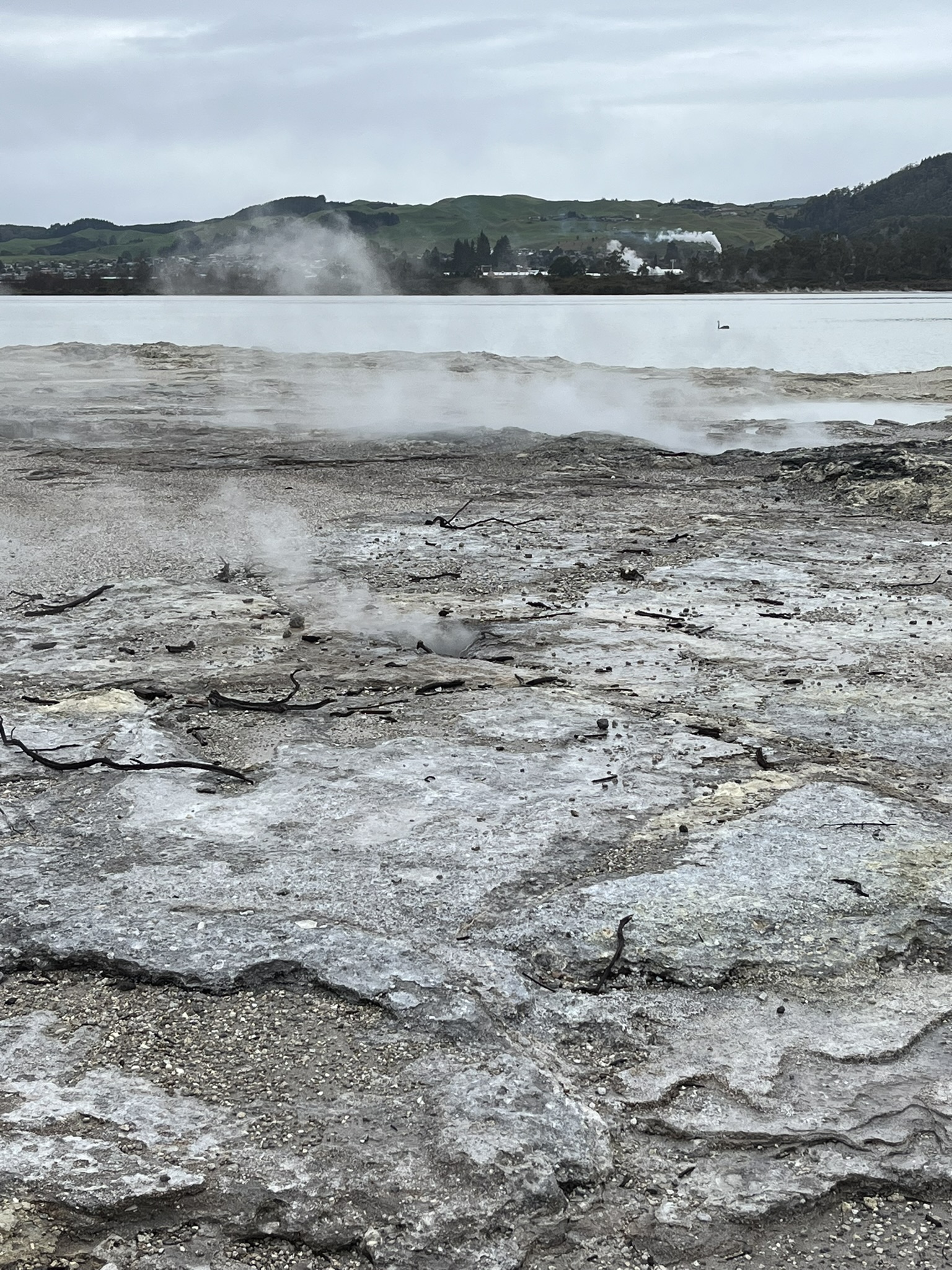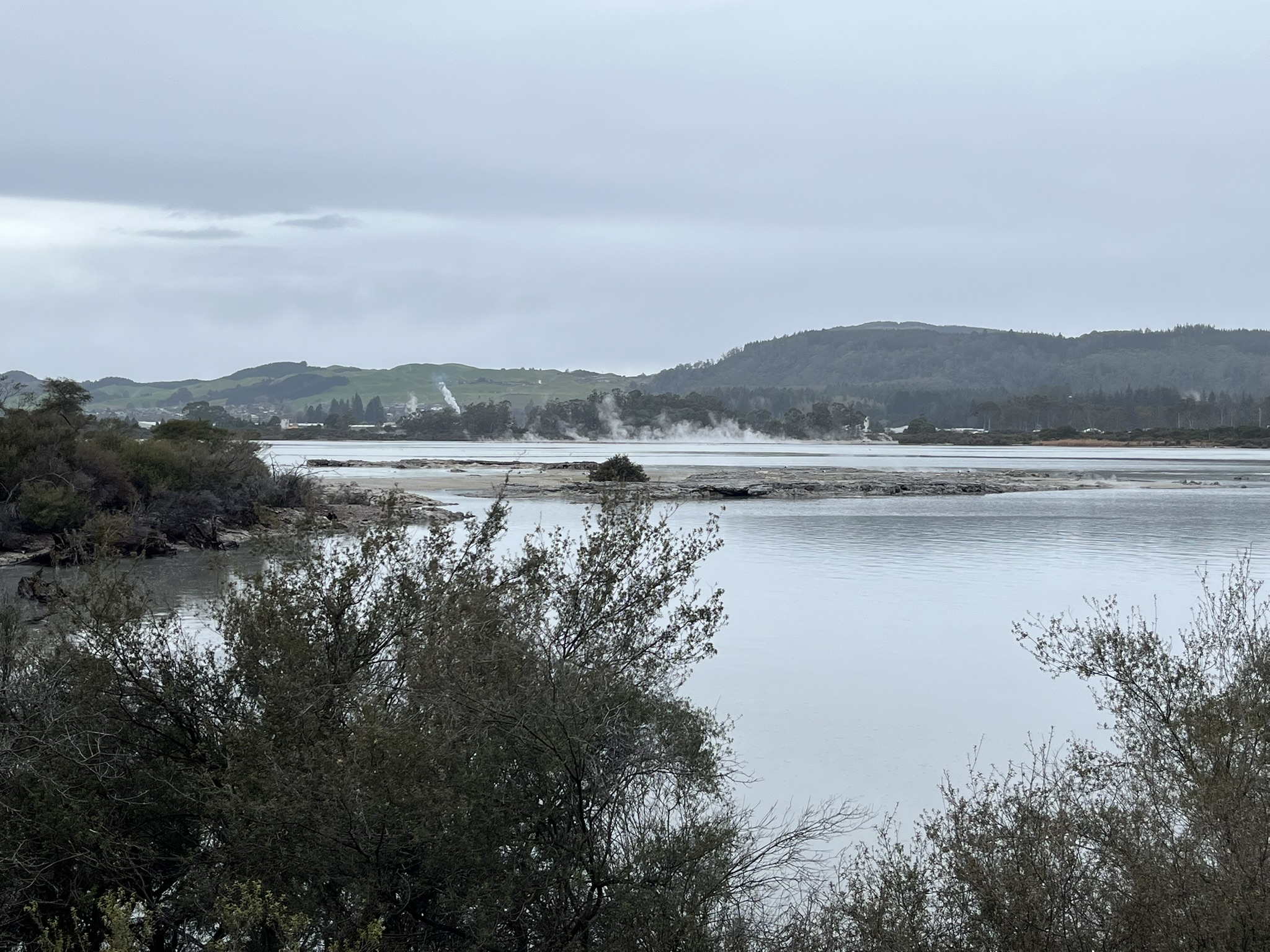 I didn’t end up leaving the hostel until after lunch, with the goal of exploring the thermal activity inside the city proper. My general plan was to walk the waterfront of Motutara point, then continue along the shore before heading back through Kuirau park which would bring me past most of the freely accessible geothermal activity in the city. Walking northeast through the drizzle from my hostel, I quickly reached the waterline with its volcanic white mud shores and smoke rising further out.