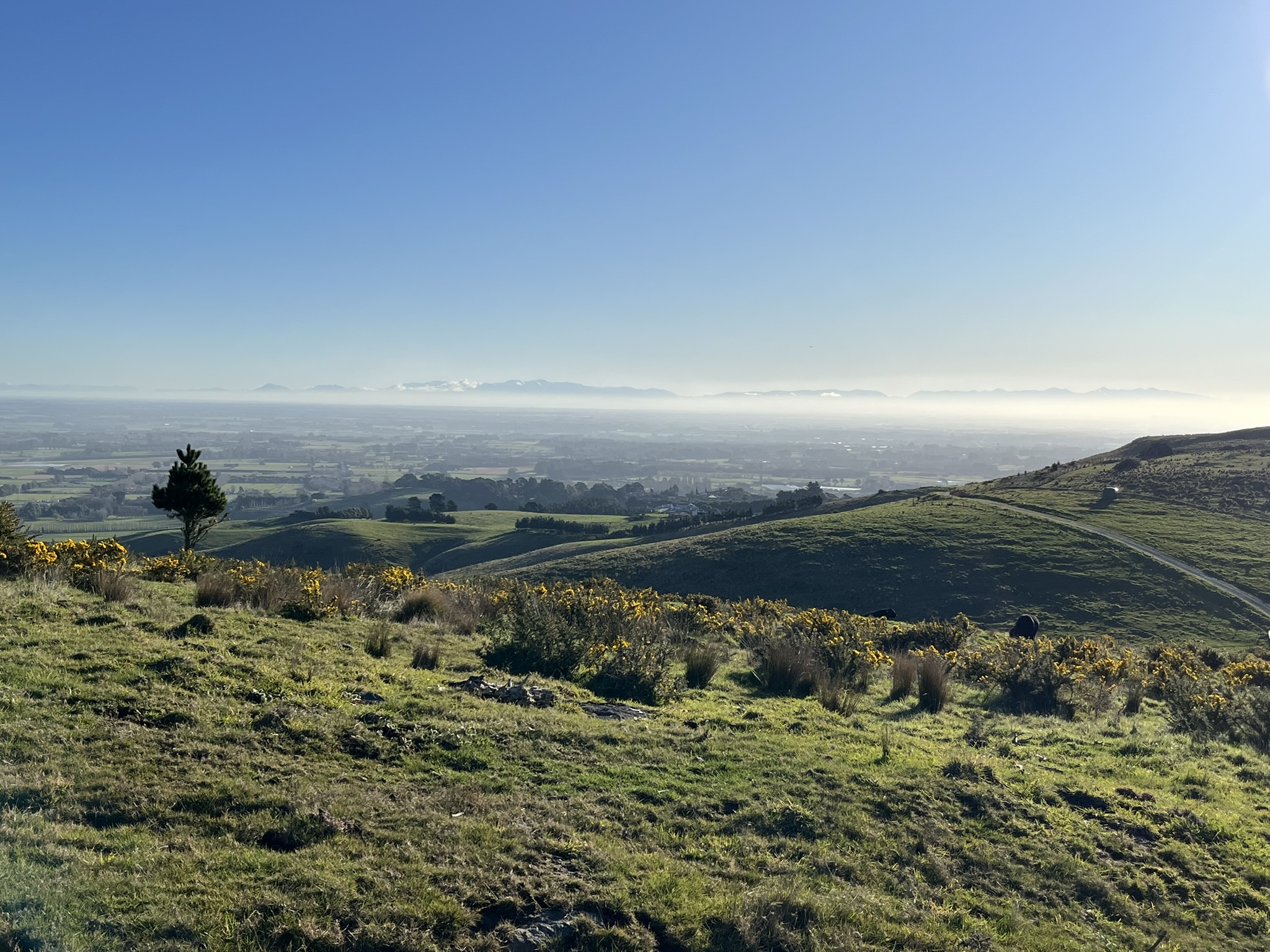 It is a very nice hike, and the weather was lovely. Climbing up through brushy pastureland with alternating sheep and cows on the sides (and a few horses), with the grass covered hills in front and the Southern Alps to my back, extending to something like 120 degrees of your view. Not to mention the beautiful but sadly invasive Gorse bushes, very dense thorny bushes with vivid yellow flowers which colours the peaks of the hills a golden yellow.