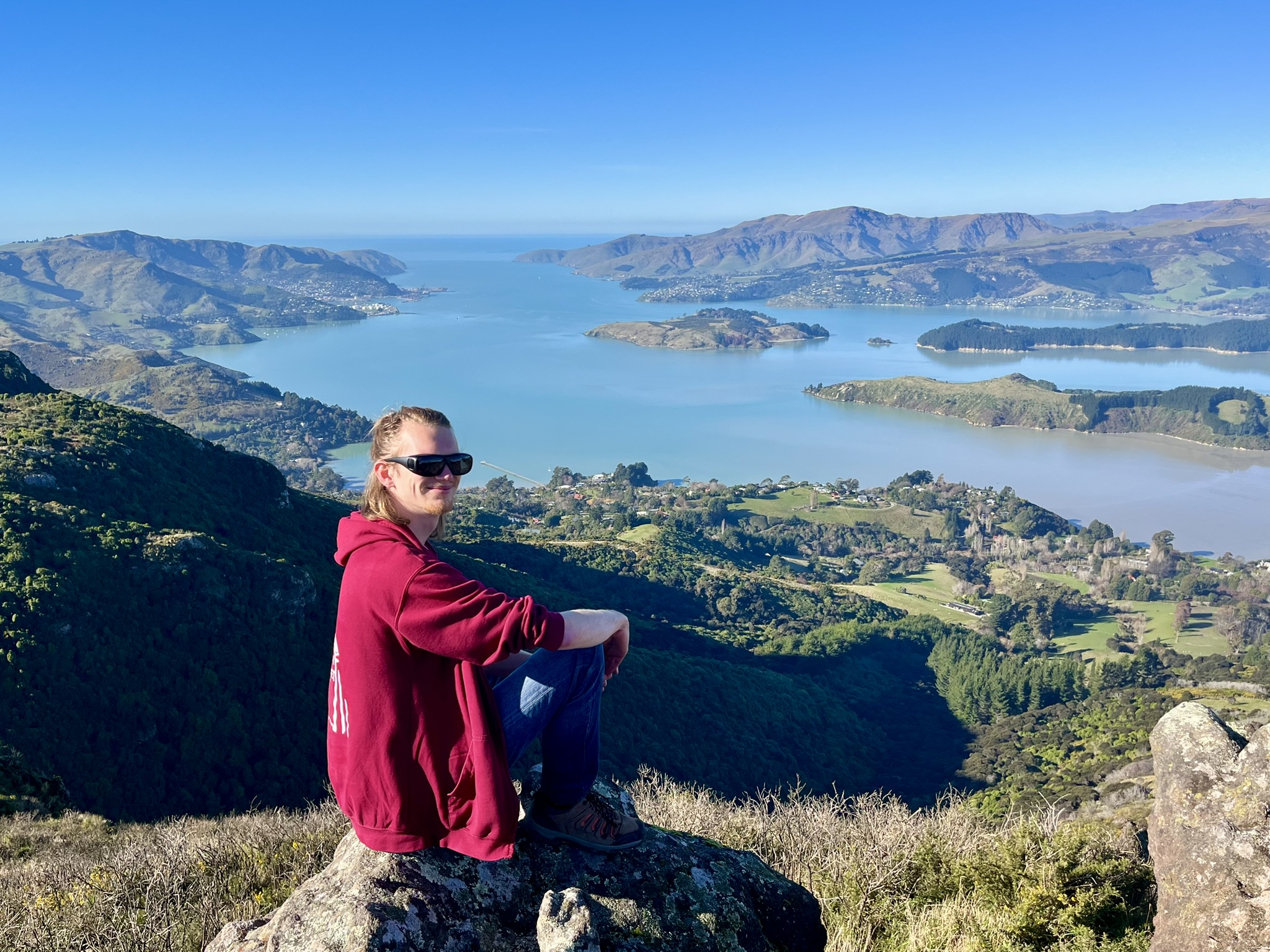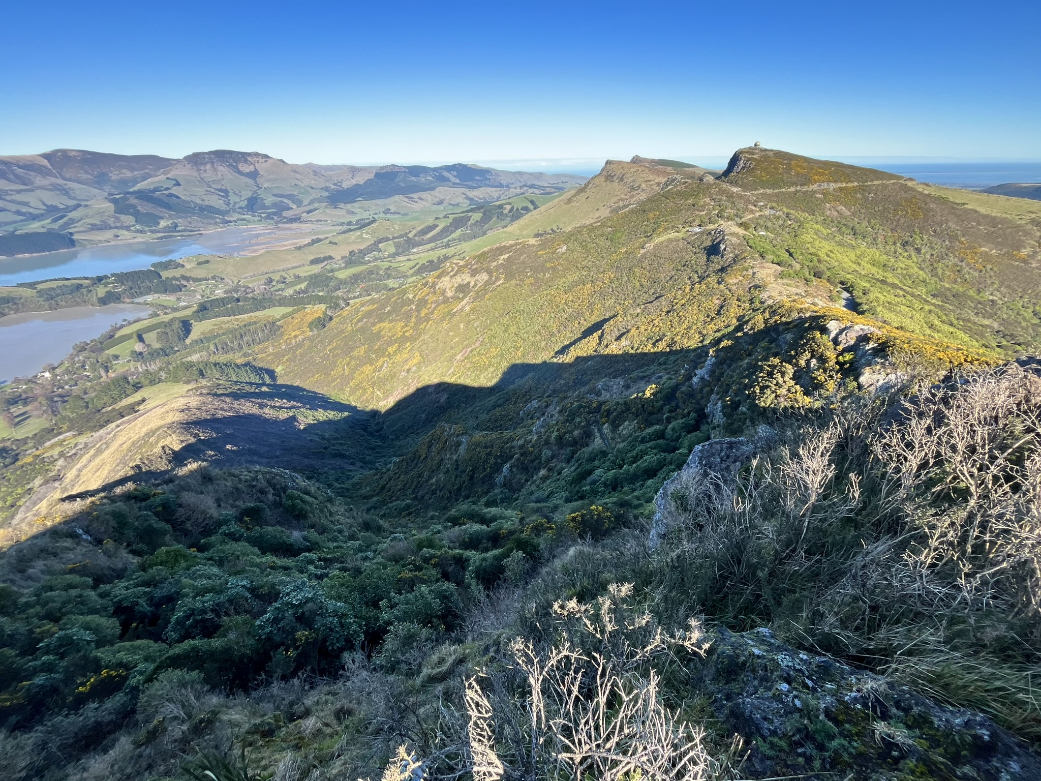 At the top of Mt Ada, I had the fika I’d brought along, and enjoyed the stunning view of Lyttleton Harbour. The Banks Peninsula, which the Port Hills forms the northwestern section of, is an ancient volcano which has been dormant for close to 10 million years, with the harbour being formed from one of the craters and the hills making up the crater rim. After a short rest, I went down again from the peak and started hiking along the rim southward where I headed into the native forest on the east side of the ridge. A very different landscape, way wetter and with sun cover, but still beautiful. And some really cool cliffs up the slopes on the following two peaks.